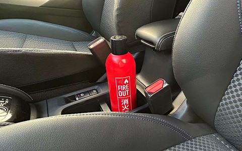 - ※FIRE OUTは、総務省消防庁の定める耐熱試験、振動試験、電気試験に合格しているので、車両への搭載が可能な消火スプレーです。夏季での使用にはご注意ください。
