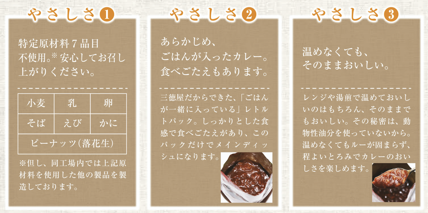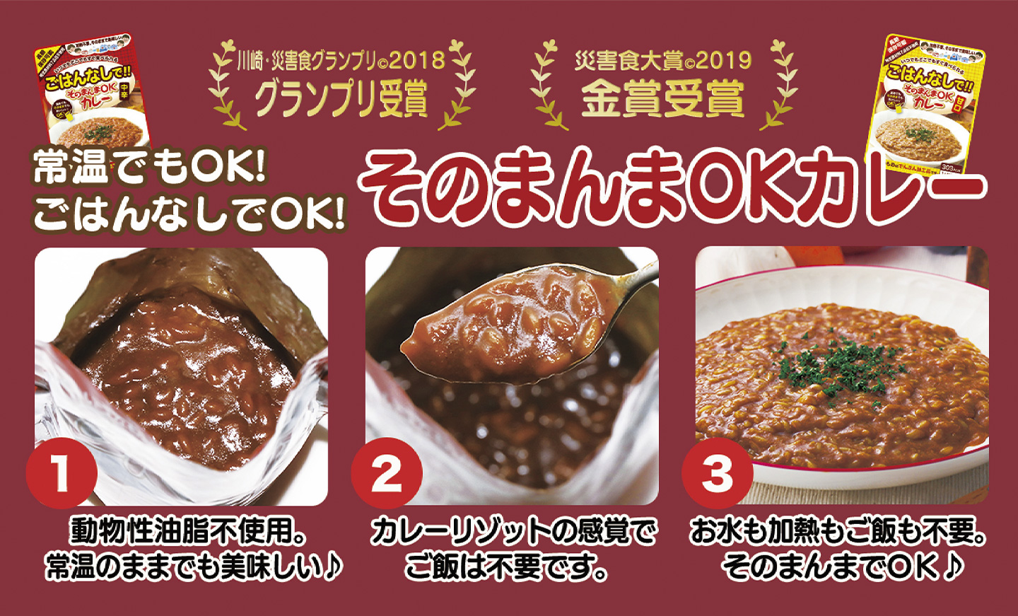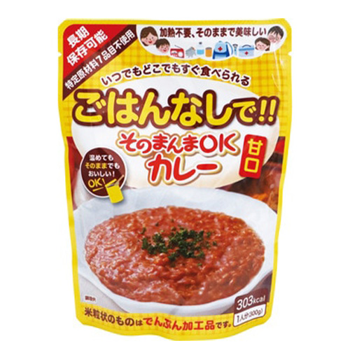アレルギーの方へ。高齢者の方へ。特定原材料7品目不使用、賞味期限5年の、みんなにやさしい、ごはんなしでそのまま食べられる「そのまんまOKカレー」。