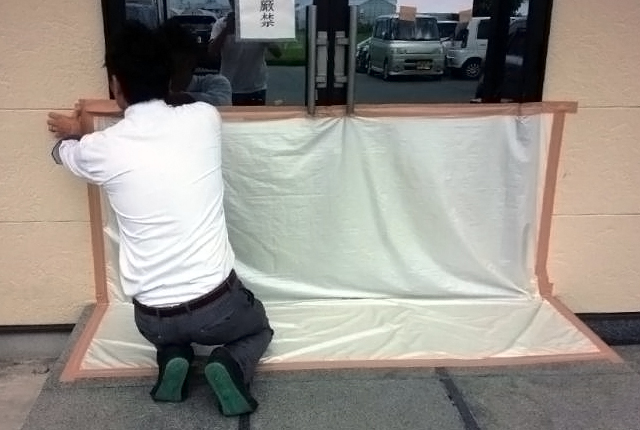 水の侵入を防ぎたい家の玄関やドアなどの入り口、ガレージなどの場所に、少し大きめに用意した「水ピタ防水シート」を、ガムテープなどを利用してなるべく隙間ができないようにピッタリと貼り付けます。